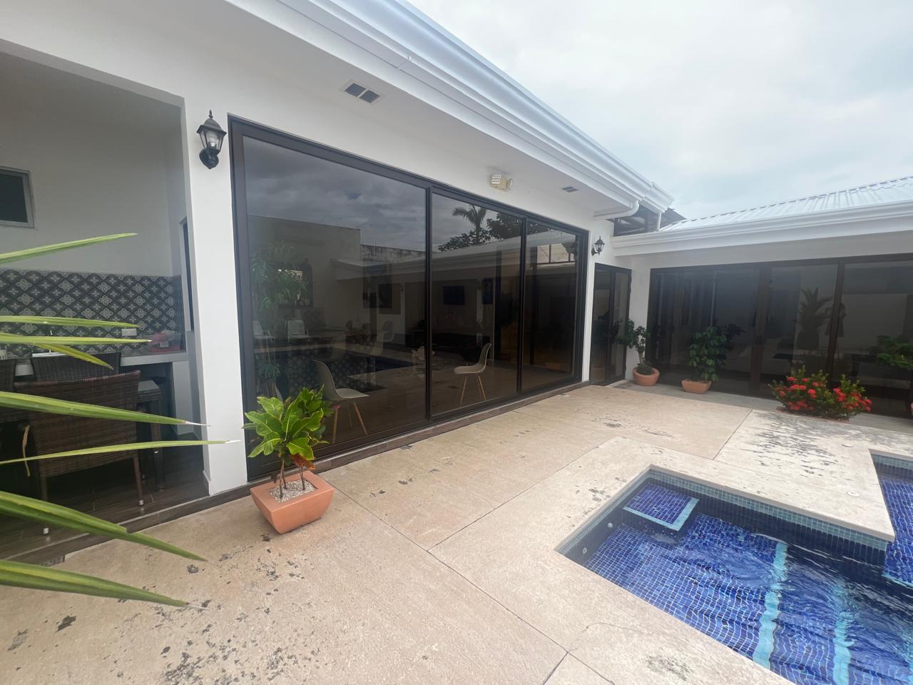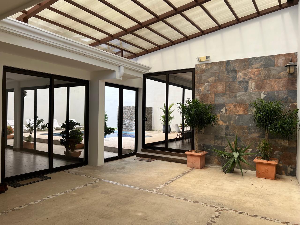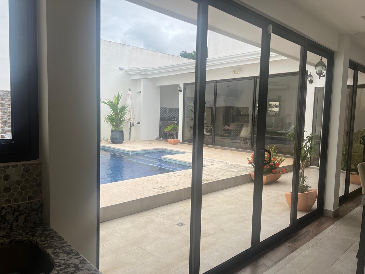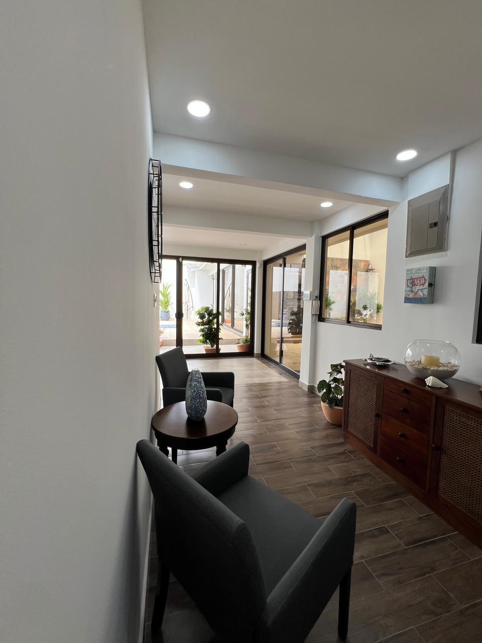 piscina se aprecia gracias a los amplios ventanales. Ingresando a la casa, puede observar un pasillo recibidor, el