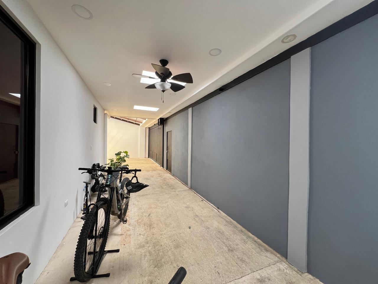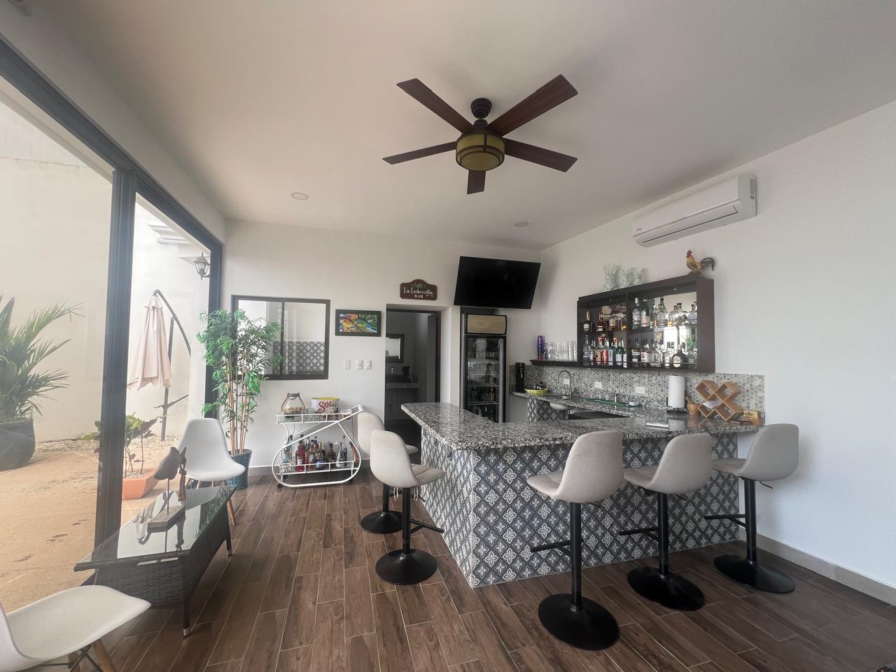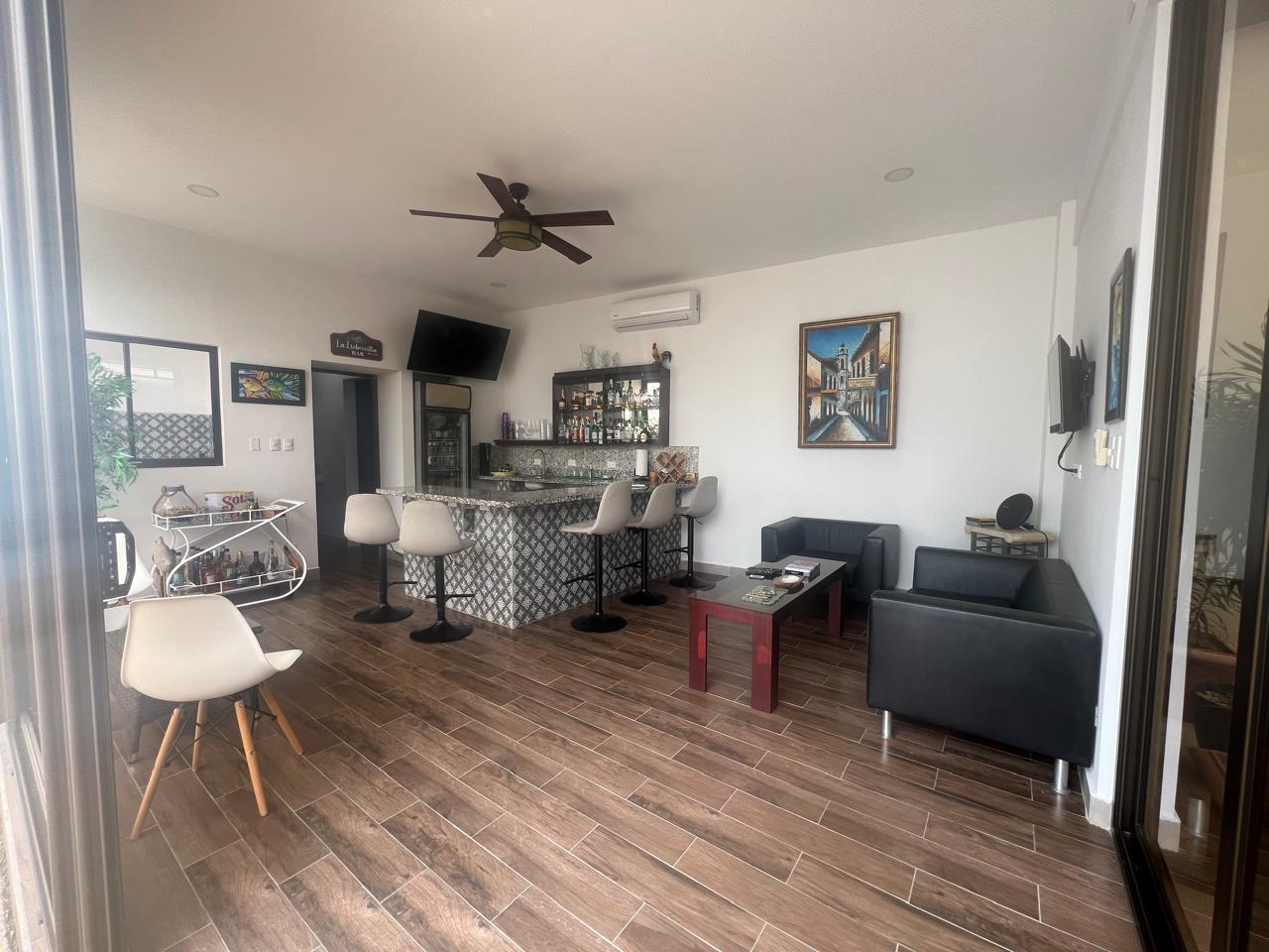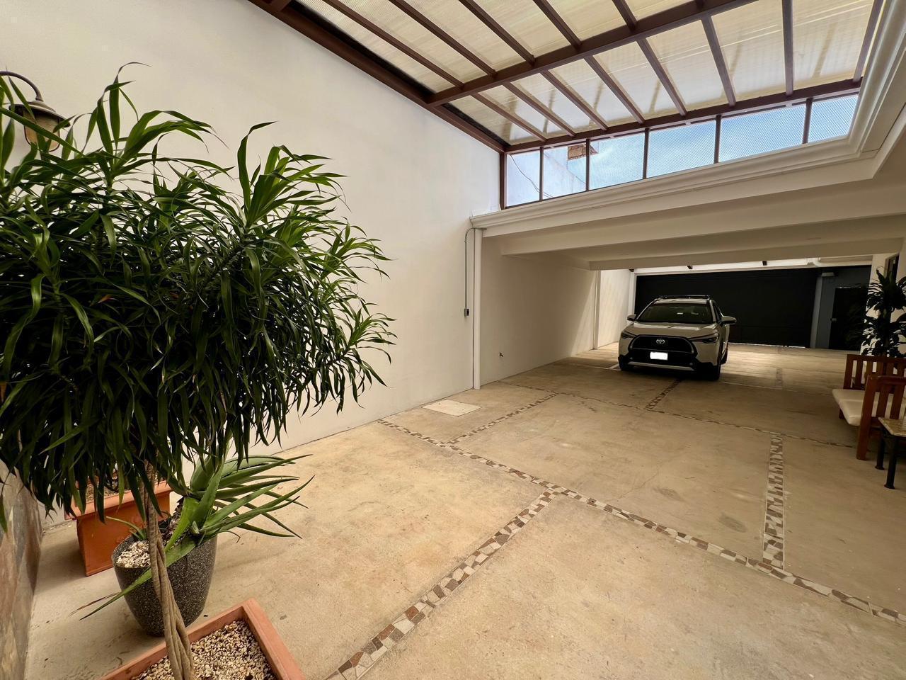 parqueo para 6 vehiculos, de frente se ubica el area de BBQ y bar privado con un baño completo. La amplia